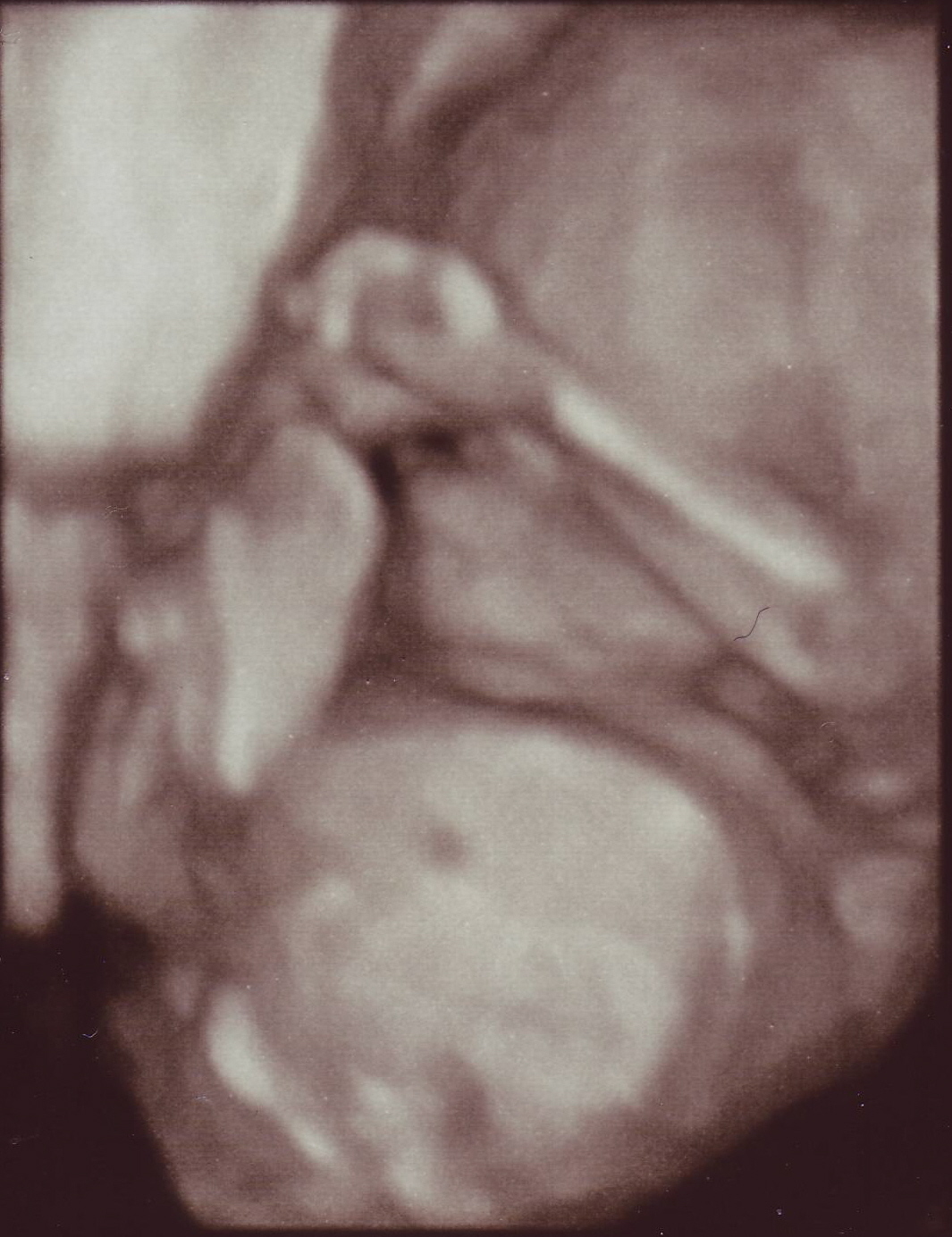 This is my son.  As you see him here, he has been alive for just about one-hundred-forty days and has, this and other ultrasound images suggest, my nose and not his mother’s.  I have not seen him any more closely than you have, have not held him in my hands, and will not hear him cry for about another one-hundred-forty days.  As you see him, he has just drawn his arm up across his left cheek, as if to shield himself from the ultrasound.  My middle brother used to make much the same gesture whenever Dad pulled out the super-8 camera with the spotlight fixed on top.