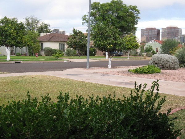 Phoenix, Arizona — Looking east from our front porch in Willo, you see the results of one of Phoenix’s bigger Big Mistakes: the distant office towers on Central Avenue.