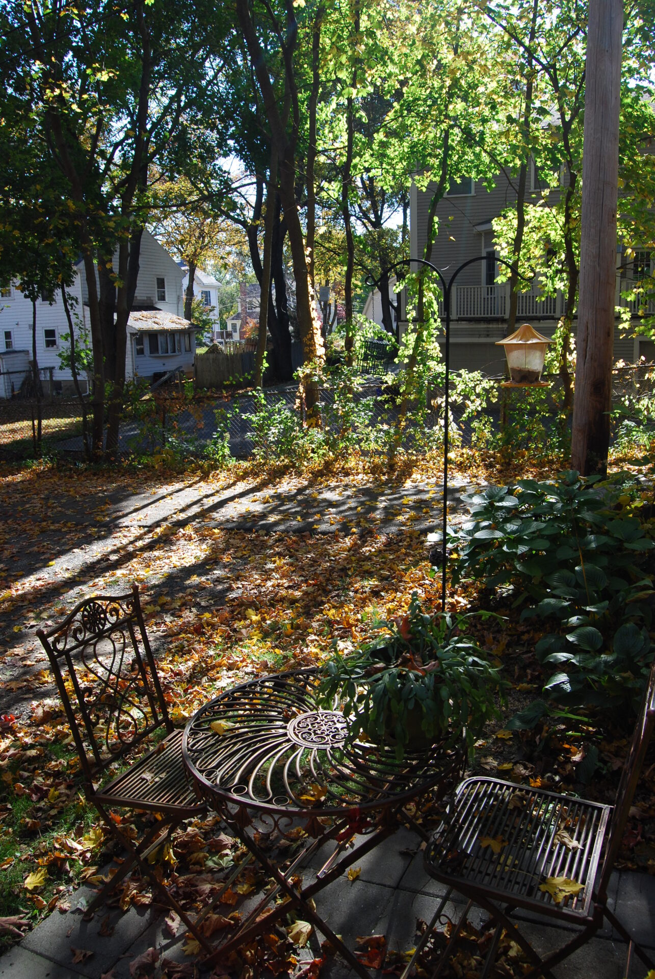 From the slab, which we call a patio, I sit in a wire chair and look across the private way at my neighbors’ back yards: at stakes for tomato plants, scaffolding to shingle rooftops, a low white shed with a hollow beneath it–home of a wood chuck who has, thus far, intimidated us from planting vegetables. Today, over the wood chuck’s shed, an orange sugar maple is losing leaves slowly, as if it has all year to sift them across our gravel drive.